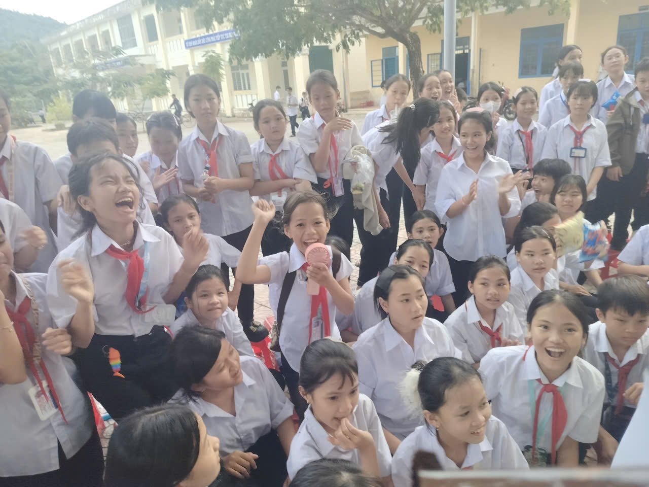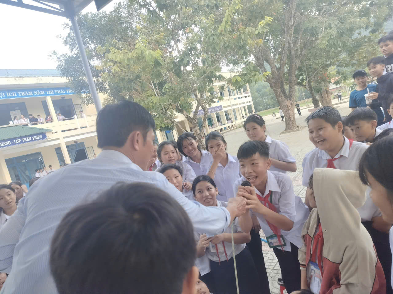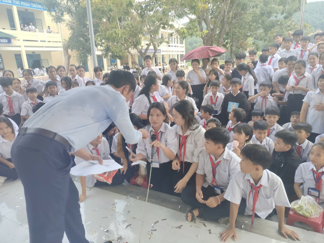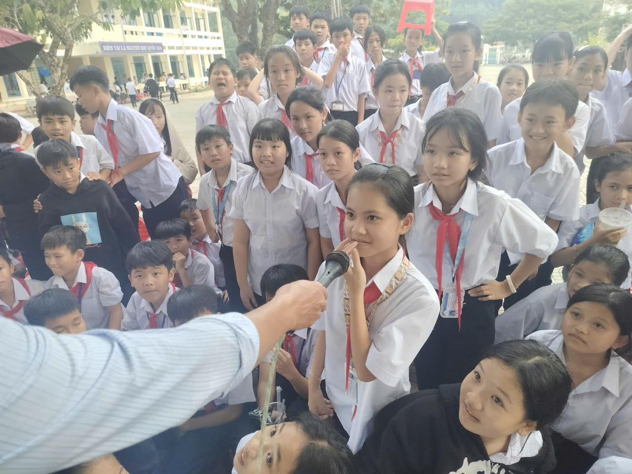 Các em học sinh hào hứng giơ tay trả lời, cười vang khi nhận được phần thưởng xinh xắn. Hoạt động không chỉ mang lại niềm vui, mà còn giúp các em rèn luyện sự nhanh nhạy, khả năng ghi nhớ và tinh thần tự tin trước đám đông.