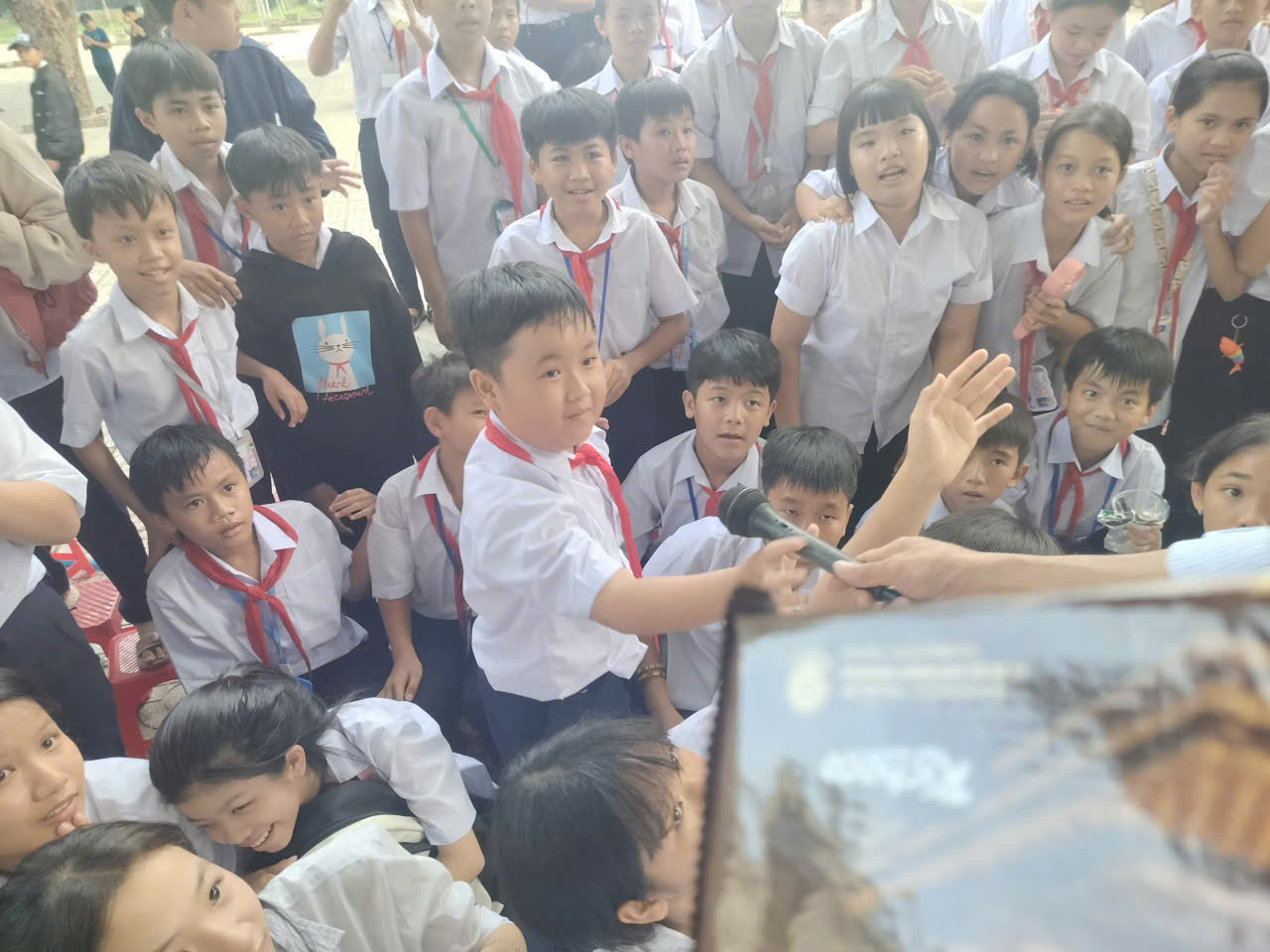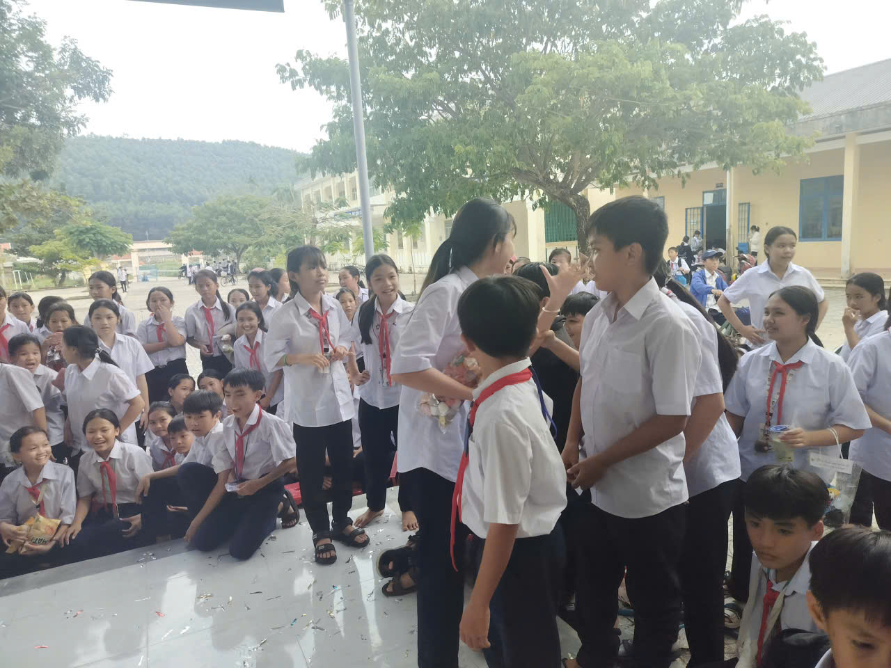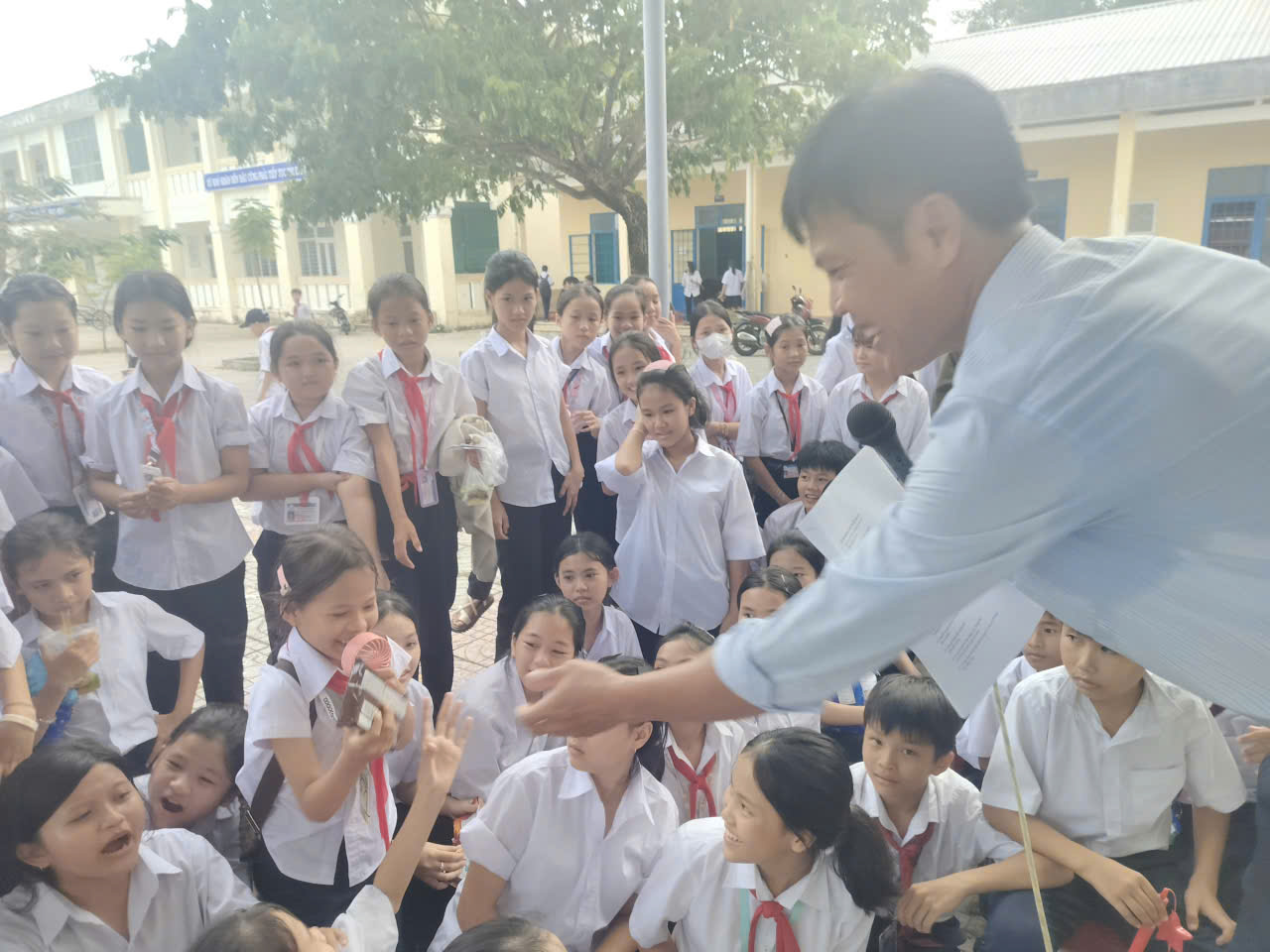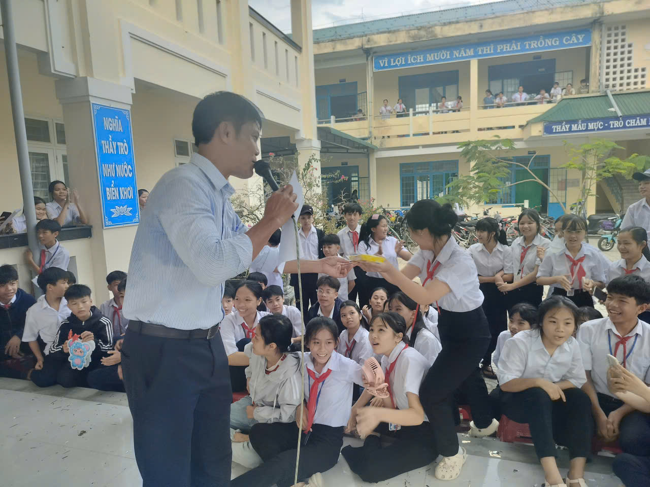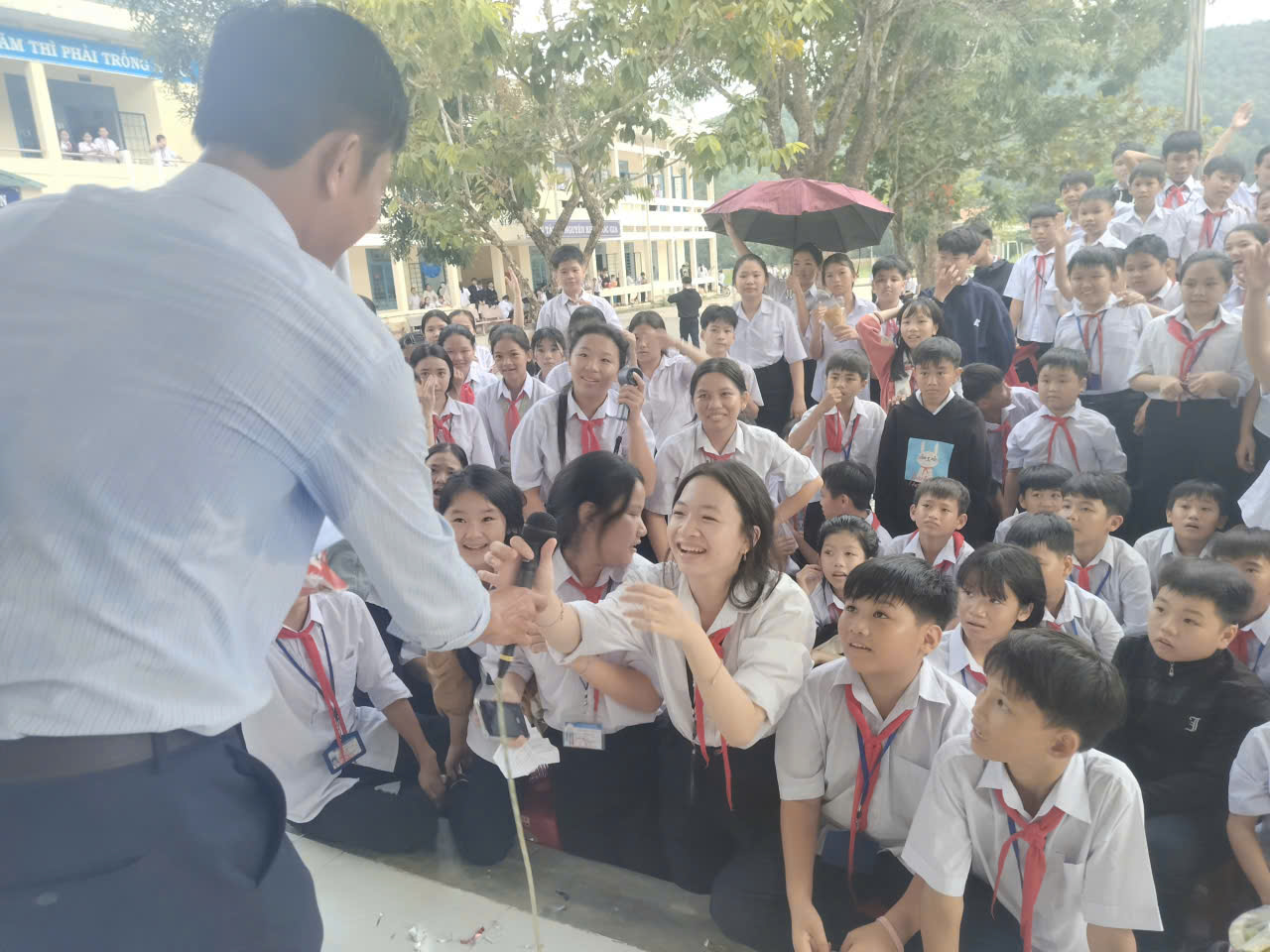 Các em học sinh hào hứng giơ tay trả lời, cười vang khi nhận được phần thưởng xinh xắn. Hoạt động không chỉ mang lại niềm vui, mà còn giúp các em rèn luyện sự nhanh nhạy, khả năng ghi nhớ và tinh thần tự tin trước đám đông.